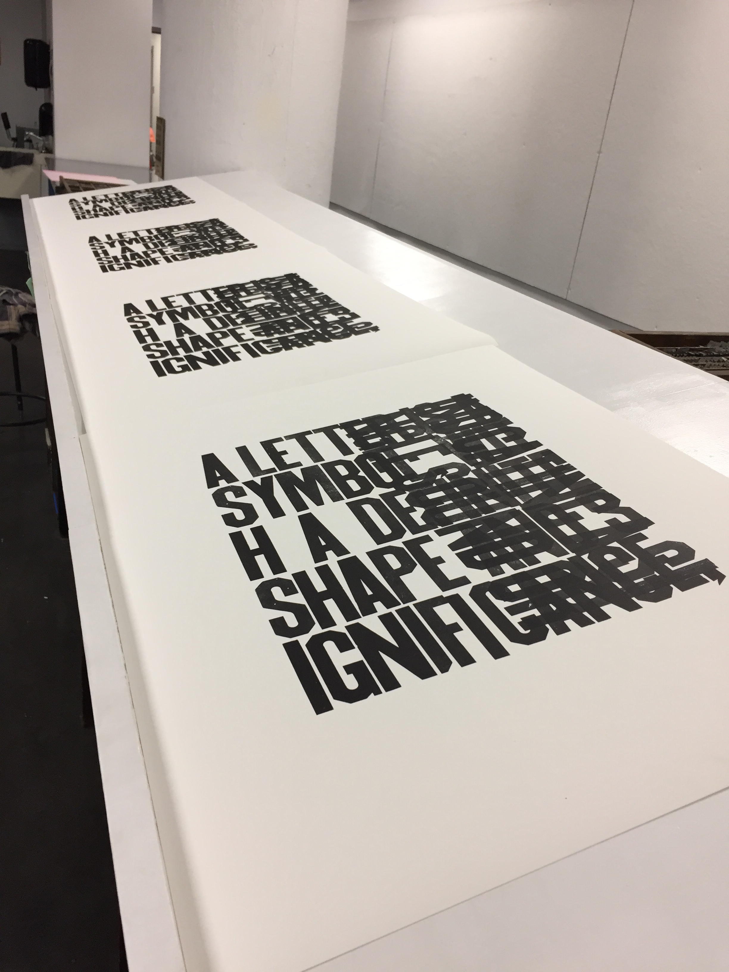 A line taken from “The Principles of New Typography,” as found in the collection Texts on Type (Heller and Meggs, 2001). Wood type letterpress printed onto Canford Card. Impossible to photograph but vibrates the eyeballs in person. Variable edition of 4.